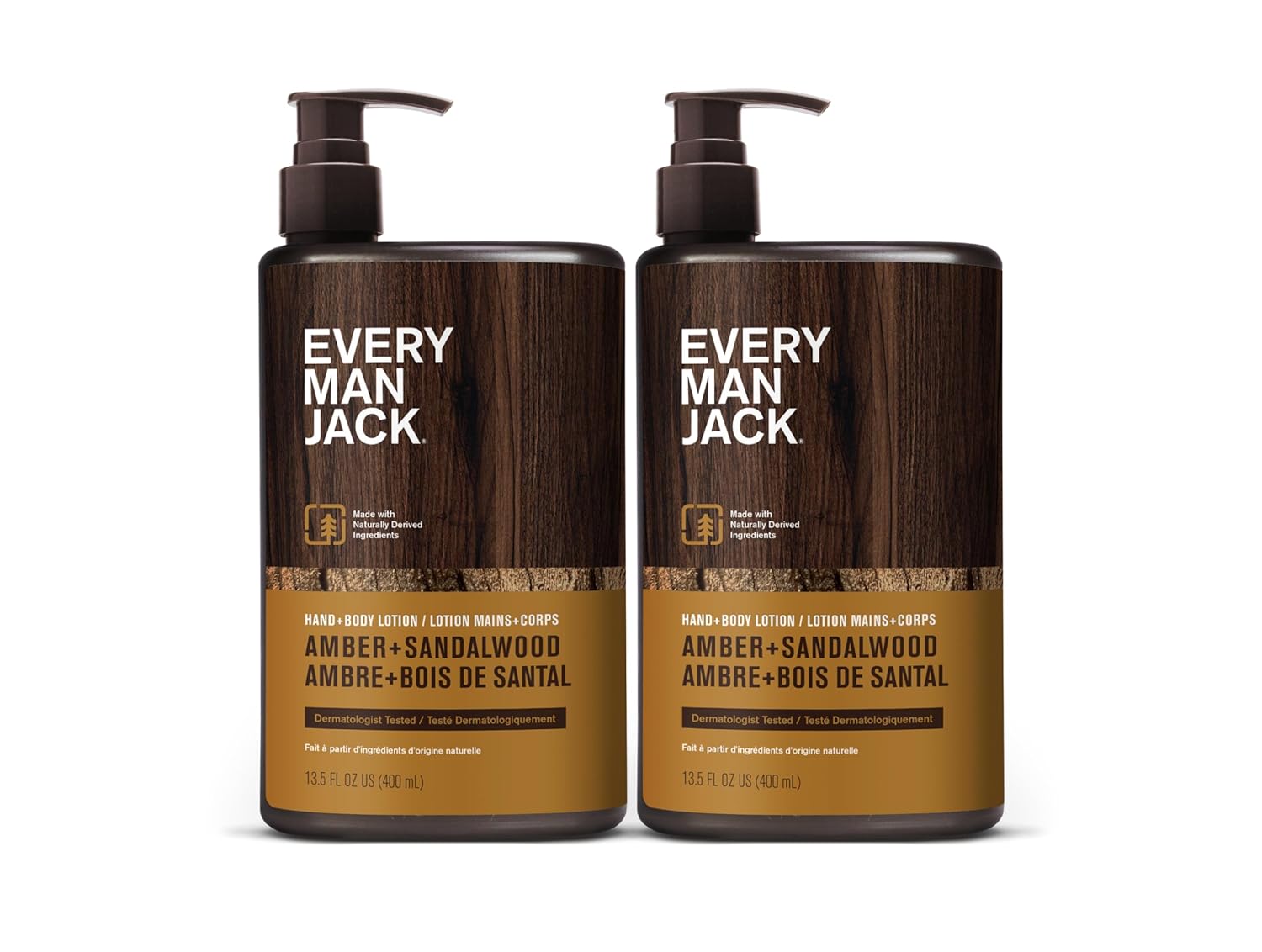 Every Man Jack Mens Amber + Sandalwood Hand & Body Lotion for All Skin Types - Dermatologist Tested & Hypoallergenic - Nourish Skin with Lightweight Fast Absorbing Lotion - 13.5oz 2 Bottles